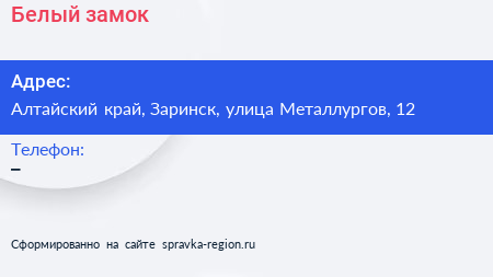 Белый замок по адресу Алтайский край, Заринск, улица Металлургов, 12 в дальнейшем Организация, размещена в следующих категориях: