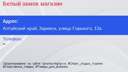 Белый замок, магазин по адресу Алтайский край, Заринск, улица Горького, 13а в дальнейшем Организация, размещена в следующих категориях: