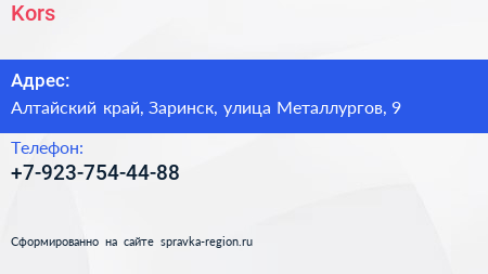 Kors по адресу Алтайский край, Заринск, улица Металлургов, 9 в дальнейшем Организация, размещена в следующих категориях: