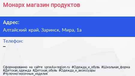 Монарх, магазин продуктов по адресу Алтайский край, Заринск, Мира, 1а в дальнейшем Организация, размещена в следующих категориях:
