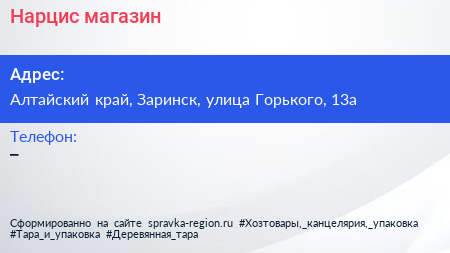 Нарцис, магазин по адресу Алтайский край, Заринск, улица Горького, 13а в дальнейшем Организация, размещена в следующих категориях: