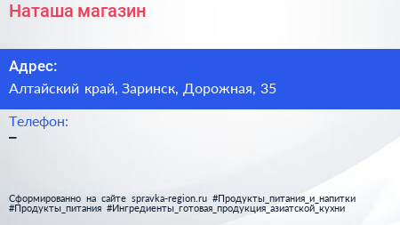 Наташа, магазин по адресу Алтайский край, Заринск, Дорожная, 35 в дальнейшем Организация, размещена в следующих категориях: