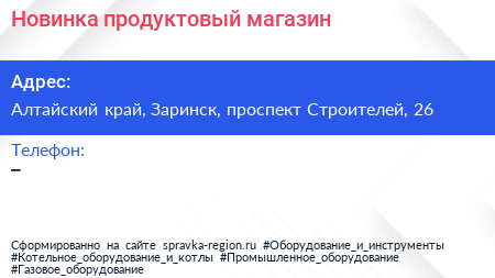 Новинка, продуктовый магазин по адресу Алтайский край, Заринск, проспект Строителей, 26 в дальнейшем Организация, размещена в следующих категориях:
