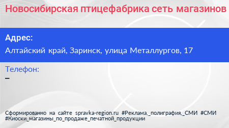 Новосибирская птицефабрика, сеть магазинов по адресу Алтайский край, Заринск, улица Металлургов, 17 в дальнейшем Организация, размещена в следующих категориях: