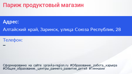 Париж, продуктовый магазин по адресу Алтайский край, Заринск, улица Союза Республик, 28 в дальнейшем Организация, размещена в следующих категориях: