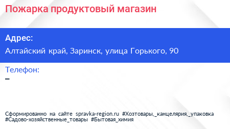 Пожарка, продуктовый магазин по адресу Алтайский край, Заринск, улица Горького, 90 в дальнейшем Организация, размещена в следующих категориях:
