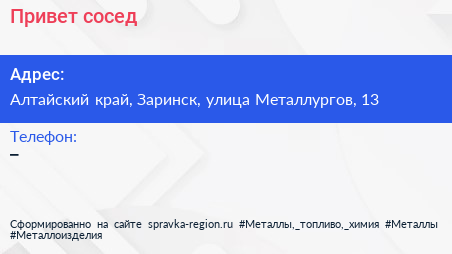 Привет, сосед! по адресу Алтайский край, Заринск, улица Металлургов, 13 в дальнейшем Организация, размещена в следующих категориях: