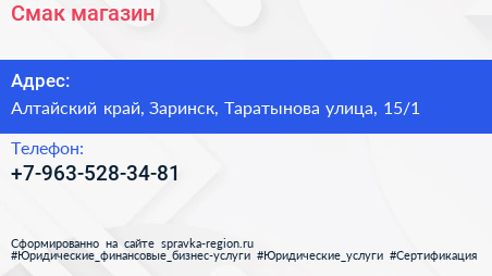 Смак, магазин по адресу Алтайский край, Заринск, Таратынова улица, 15/1 в дальнейшем Организация, размещена в следующих категориях: