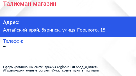 Талисман, магазин по адресу Алтайский край, Заринск, улица Горького, 15 в дальнейшем Организация, размещена в следующих категориях: