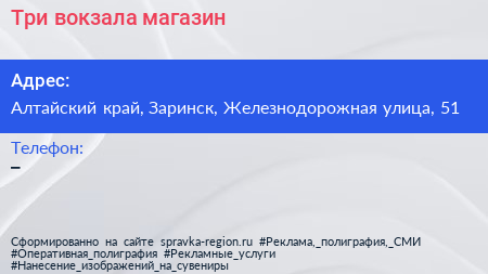 Три вокзала, магазин по адресу Алтайский край, Заринск, Железнодорожная улица, 51 в дальнейшем Организация, размещена в следующих категориях: