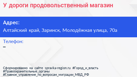 У дороги, продовольственный магазин по адресу Алтайский край, Заринск, Молодёжная улица, 70а в дальнейшем Организация, размещена в следующих категориях: