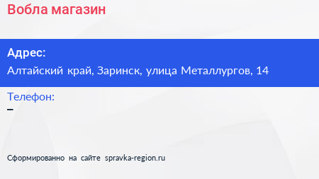 Вобла, магазин по адресу Алтайский край, Заринск, улица Металлургов, 14 в дальнейшем Организация, размещена в следующих категориях: