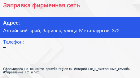 Заправка, фирменная сеть по адресу Алтайский край, Заринск, улица Металлургов, 3/2 в дальнейшем Организация, размещена в следующих категориях: