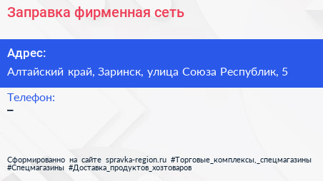 Заправка, фирменная сеть по адресу Алтайский край, Заринск, улица Союза Республик, 5 в дальнейшем Организация, размещена в следующих категориях: