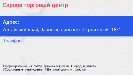 Европа, торговый центр по адресу Алтайский край, Заринск, проспект Строителей, 18/1 в дальнейшем Организация, размещена в следующих категориях: