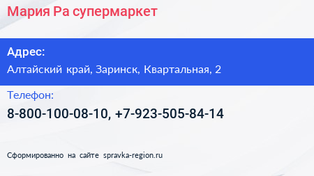 Мария-Ра, супермаркет по адресу Алтайский край, Заринск, Квартальная, 2 в дальнейшем Организация, размещена в следующих категориях: