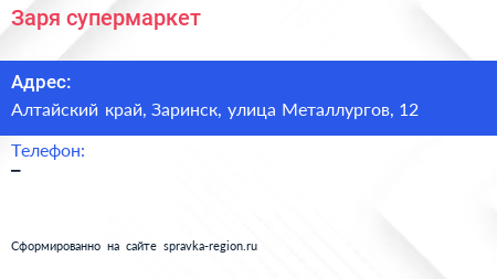 Заря, супермаркет по адресу Алтайский край, Заринск, улица Металлургов, 12 в дальнейшем Организация, размещена в следующих категориях: