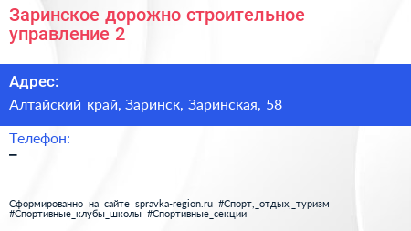 Заринское дорожно-строительное управление №2 по адресу Алтайский край, Заринск, Заринская, 58 в дальнейшем Организация, размещена в следующих категориях: