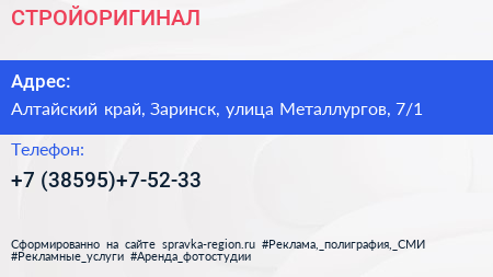 СТРОЙОРИГИНАЛ по адресу Алтайский край, Заринск, улица Металлургов, 7/1 в дальнейшем Организация, размещена в следующих категориях: