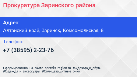 Прокуратура Заринского района по адресу Алтайский край, Заринск, Комсомольская, 8 в дальнейшем Организация, размещена в следующих категориях: