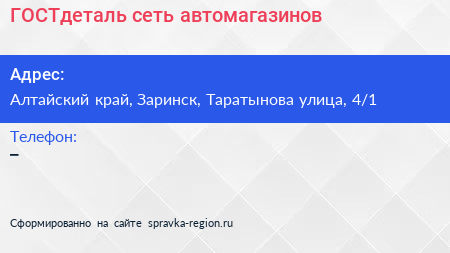 ГОСТдеталь, сеть автомагазинов по адресу Алтайский край, Заринск, Таратынова улица, 4/1 в дальнейшем Организация, размещена в следующих категориях: