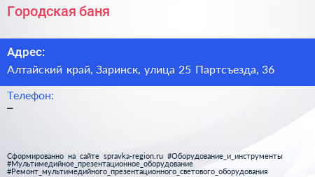 Городская баня по адресу Алтайский край, Заринск, улица 25 Партсъезда, 36 в дальнейшем Организация, размещена в следующих категориях: