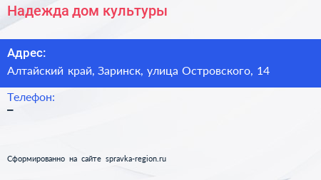 Надежда, дом культуры по адресу Алтайский край, Заринск, улица Островского, 14 в дальнейшем Организация, размещена в следующих категориях: