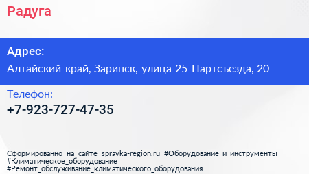 Радуга по адресу Алтайский край, Заринск, улица 25 Партсъезда, 20 в дальнейшем Организация, размещена в следующих категориях: