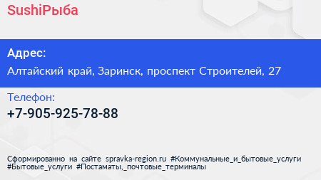 SushiРыба по адресу Алтайский край, Заринск, проспект Строителей, 27 в дальнейшем Организация, размещена в следующих категориях: