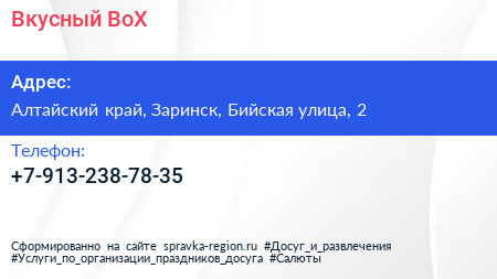 Вкусный BoX по адресу Алтайский край, Заринск, Бийская улица, 2 в дальнейшем Организация, размещена в следующих категориях:
