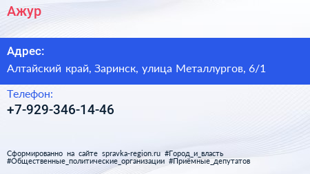 Ажур по адресу Алтайский край, Заринск, улица Металлургов, 6/1 в дальнейшем Организация, размещена в следующих категориях: