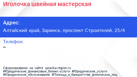 Иголочка, швейная мастерская по адресу Алтайский край, Заринск, проспект Строителей, 25/4 в дальнейшем Организация, размещена в следующих категориях: