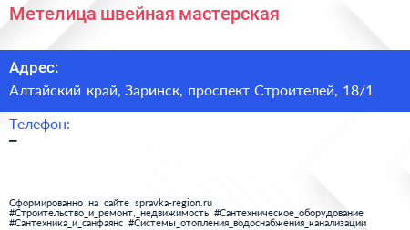 Метелица, швейная мастерская по адресу Алтайский край, Заринск, проспект Строителей, 18/1 в дальнейшем Организация, размещена в следующих категориях: