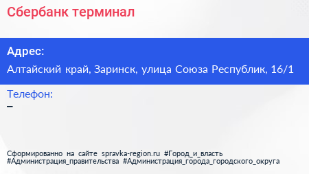 Сбербанк, терминал по адресу Алтайский край, Заринск, улица Союза Республик, 16/1 в дальнейшем Организация, размещена в следующих категориях: