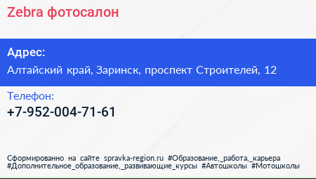 Zebra, фотосалон по адресу Алтайский край, Заринск, проспект Строителей, 12 в дальнейшем Организация, размещена в следующих категориях: