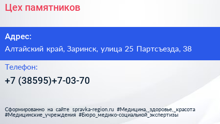 Цех памятников по адресу Алтайский край, Заринск, улица 25 Партсъезда, 38 в дальнейшем Организация, размещена в следующих категориях: