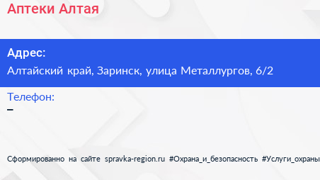 Аптеки Алтая по адресу Алтайский край, Заринск, улица Металлургов, 6/2 в дальнейшем Организация, размещена в следующих категориях: