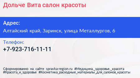 Дольче Вита, салон красоты по адресу Алтайский край, Заринск, улица Металлургов, 6 в дальнейшем Организация, размещена в следующих категориях: