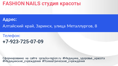 FASHION NAILS, студия красоты по адресу Алтайский край, Заринск, улица Металлургов, 8 в дальнейшем Организация, размещена в следующих категориях: