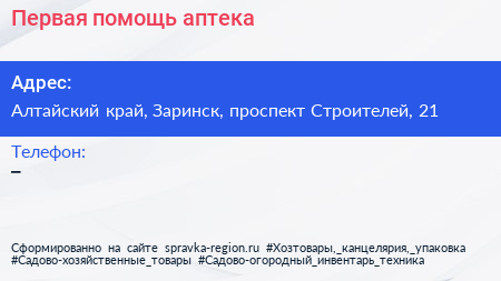Первая помощь, аптека по адресу Алтайский край, Заринск, проспект Строителей, 21 в дальнейшем Организация, размещена в следующих категориях: