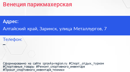 Венеция, парикмахерская по адресу Алтайский край, Заринск, улица Металлургов, 7 в дальнейшем Организация, размещена в следующих категориях: