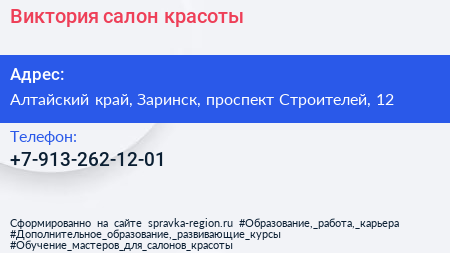 Виктория, салон красоты по адресу Алтайский край, Заринск, проспект Строителей, 12 в дальнейшем Организация, размещена в следующих категориях: