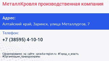 МеталлКровля, производственная компания по адресу Алтайский край, Заринск, улица Металлургов, 7 в дальнейшем Организация, размещена в следующих категориях: