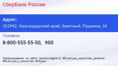 СберБанк России по адресу 352942, Краснодарский край, Заветный, Пушкина, 34 в дальнейшем Организация, размещена в следующих категориях: