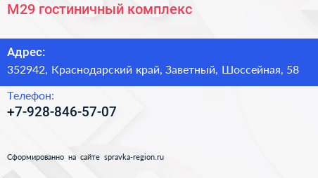 М29, гостиничный комплекс по адресу 352942, Краснодарский край, Заветный, Шоссейная, 58 в дальнейшем Организация, размещена в следующих категориях: