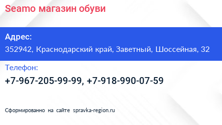 Seamo, магазин обуви по адресу 352942, Краснодарский край, Заветный, Шоссейная, 32 в дальнейшем Организация, размещена в следующих категориях: