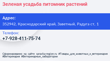 Зеленая усадьба, питомник растений по адресу 352942, Краснодарский край, Заветный, Радуга ст, 1 в дальнейшем Организация, размещена в следующих категориях: