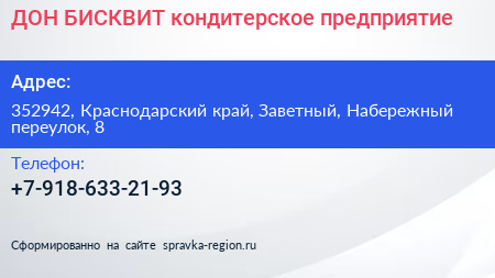 ДОН БИСКВИТ, кондитерское предприятие по адресу 352942, Краснодарский край, Заветный, Набережный переулок, 8 в дальнейшем Организация, размещена в следующих категориях: