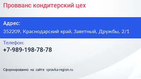 Провванс, кондитерский цех по адресу 352209, Краснодарский край, Заветный, Дружбы, 2/1 в дальнейшем Организация, размещена в следующих категориях: