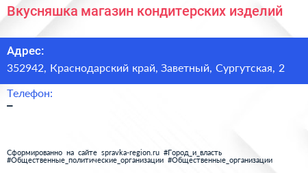 Вкусняшка, магазин кондитерских изделий по адресу 352942, Краснодарский край, Заветный, Сургутская, 2 в дальнейшем Организация, размещена в следующих категориях: